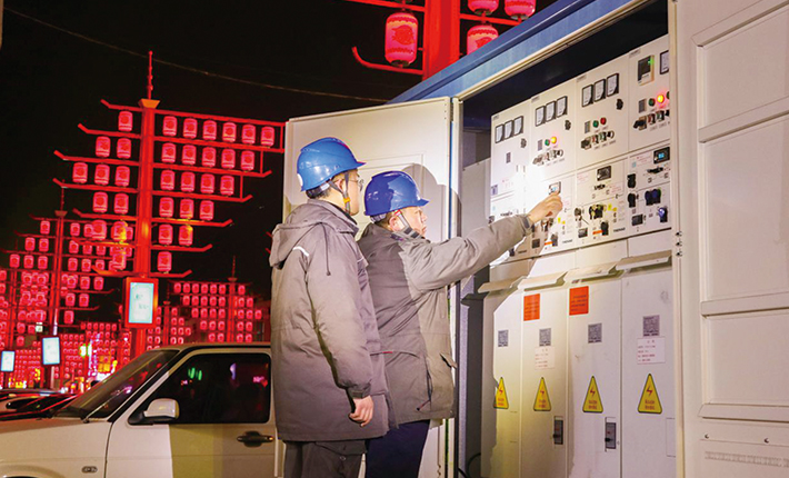 元宵佳节将至,在锦簇华灯掩映下,包头市九原区横竖街行人络绎不绝,一派喜庆祥和景象。新都市区供电公司在晚间用电负荷高峰时段开展节日保电巡视,守护着节日烟火气。