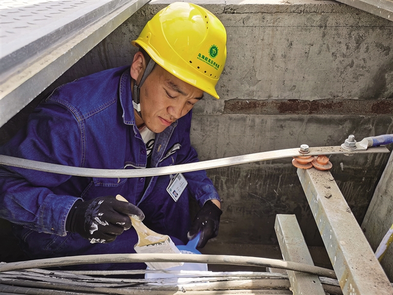 在乌海超高压供电工地吉兰太500千伏变电站电缆沟内,工作人员正在对站内电缆涂刷防火漆,消除安全隐患。 孟和