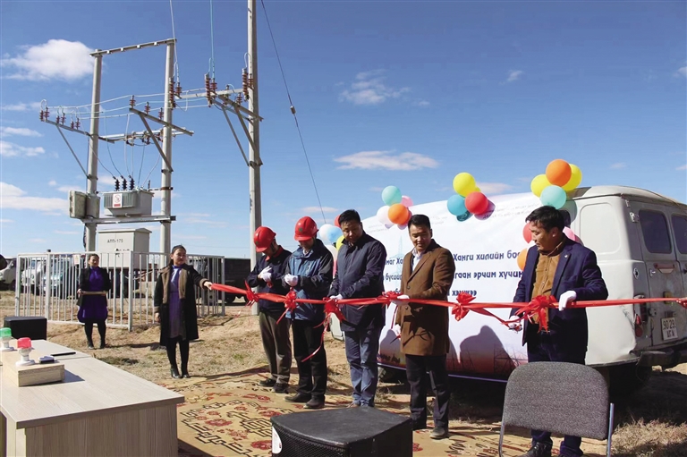 2018年10月,蒙古国东戈壁省哈腾保力格县杭吉口岸生活区居民区正式供电,图左为送电当日在杭吉口岸生活区举行的剪彩仪式。