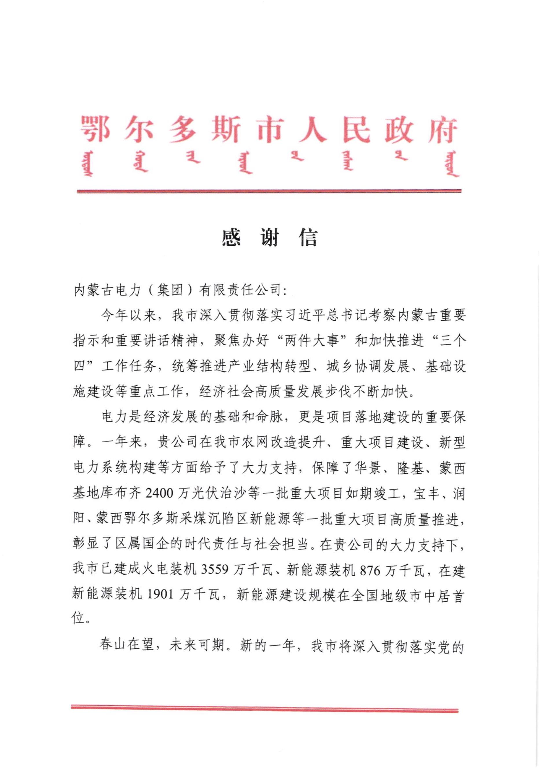 电力是经济发展的基础和命脉,更是项目落地建设的重要保障。 一年来,贵公司在我市农网改造提升、重大项目建设、新型电力系统构建等方面给予了大力支持,保障了华景、隆基、蒙西基地库布齐2400万光伏治沙等一批重大项目如期竣工,宝丰、润阳、蒙西鄂尔多斯采煤沉陷区新能源等一批重大项目高质量推进, 彰显了区属国企的时代责任与社会担当。在贵公司的大力支持下, 我市已建成火电装机3559万千瓦、新能源装机876万千瓦,在建新能源装机1901万千瓦,新能源建设规模在全国地级市中居首位。