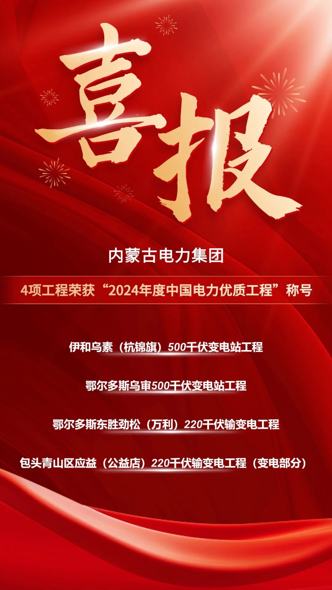 9月2日,中国电力建设企业协会公布2024年度中国电力优质工程评审结果,内蒙古电力集团承建的伊和乌素(杭锦旗)500千伏变电站工程、鄂尔多斯乌审500千伏变电站工程、鄂尔多斯东胜劲松(万利)220千伏输变电工程、包头青山区应益(公益店)220千伏输变电工程(变电部分)4项工程荣获“2024年度中国电力优质工程”称号。