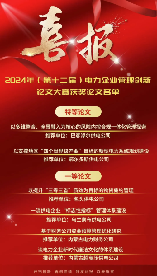 电力企业管理创新论文大赛是全国电力行业最高级别的管理创新论文比赛,公司多项管理创新论文获得荣誉,既是对公司管理创新水平的充分认可,更是公司聚焦创新驱动“引擎”、培育新发展动能的最好诠释。近年来,内蒙古电力集团深入实施“1469”中长期发展战略,围绕“产品卓越、品牌卓著、创新领先、治理现代”要求,全面开展建设世界一流企业专项行动,持续推动管理创新向纵深发展,健全管理创新“项目立项-培训辅导-成果评审-成效评估-转化推广”闭环管理机制,拓宽创新视野,探索创新模式,深化创新实践,创新潜能充分释放,涌现出一大批优秀管理创新论文和成果,推动企业提质增效,逐步实现由要素驱动向创新驱动转变,为集团公司建成世界一流现代化能源服务企业提供不竭创新源泉。