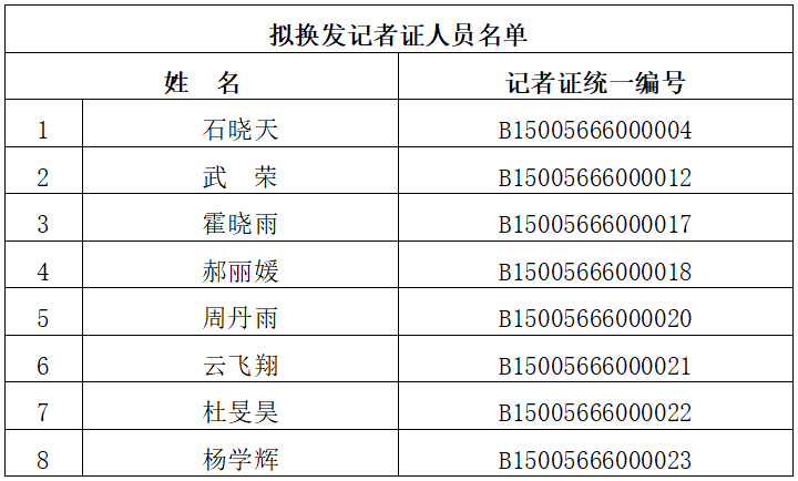 按照国家新闻出版署《关于开展2024年第七版新闻记者证全国统一换发工作的通知》(国新出发函〔2024〕176号)要求,现对内蒙古电力报社2024年度记者证持有人员进行统一换证,经核验排查,该报社共有8人符合持证条件,现进行公示: