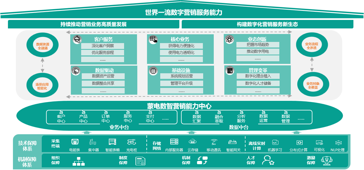 2021年5月以来,集团公司放眼大势,统筹全局,通过全面梳理各项业务、深入开展内外调研,成功“绘制”出营销数字化转型蓝图,明确“1234”的建设思路,出台《客户用电服务数字化转型行动方案》,构建以“一系统为核心,双中台为引擎,19个能力中心为支柱,辅以多公用组件资产”的企业级数字化技术架构。