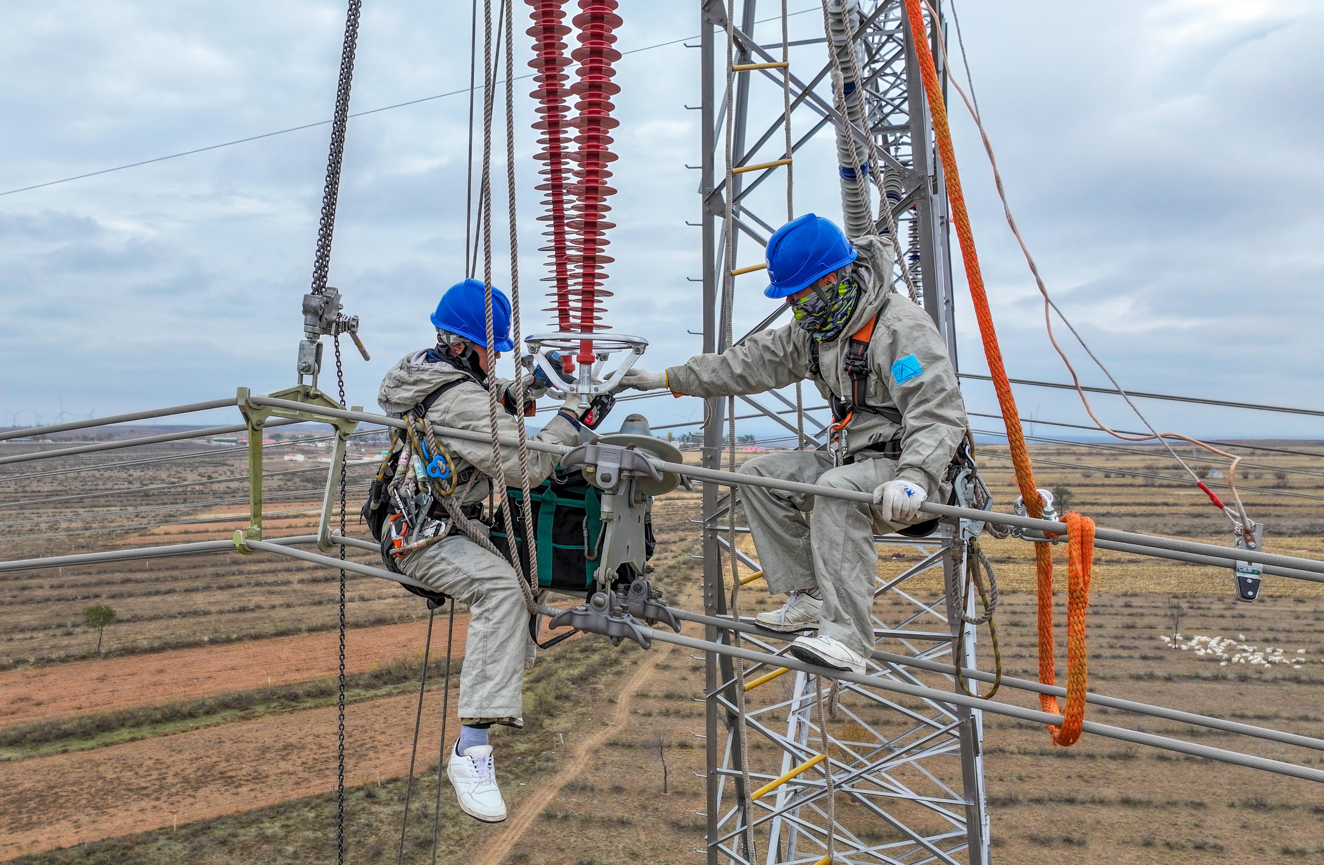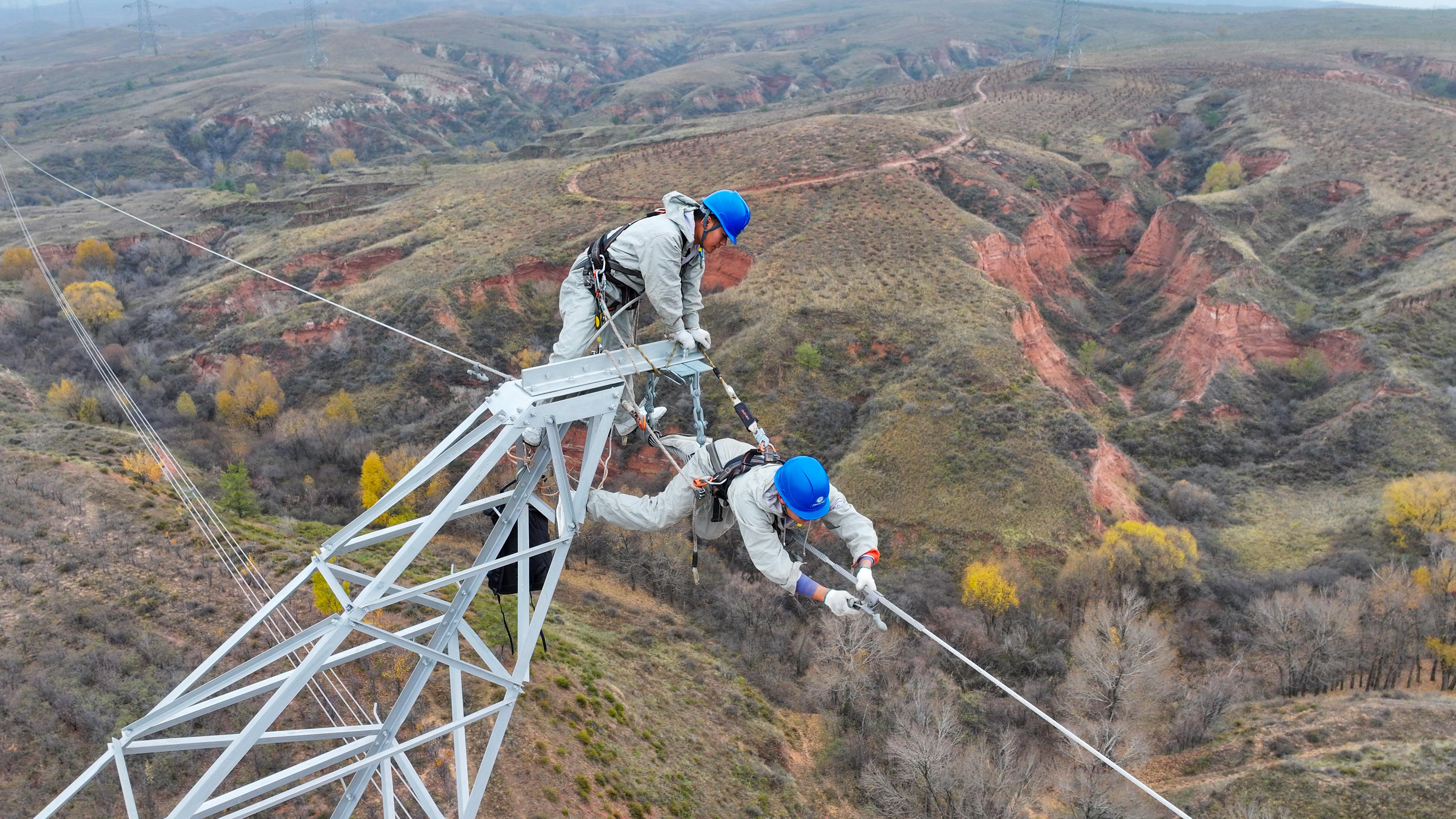 11月4日,在乌海超高压供电公司500千伏布乌一线线路破口接入、综合治理现场,370余名工作人员正在如火如荼地开展检修工作。