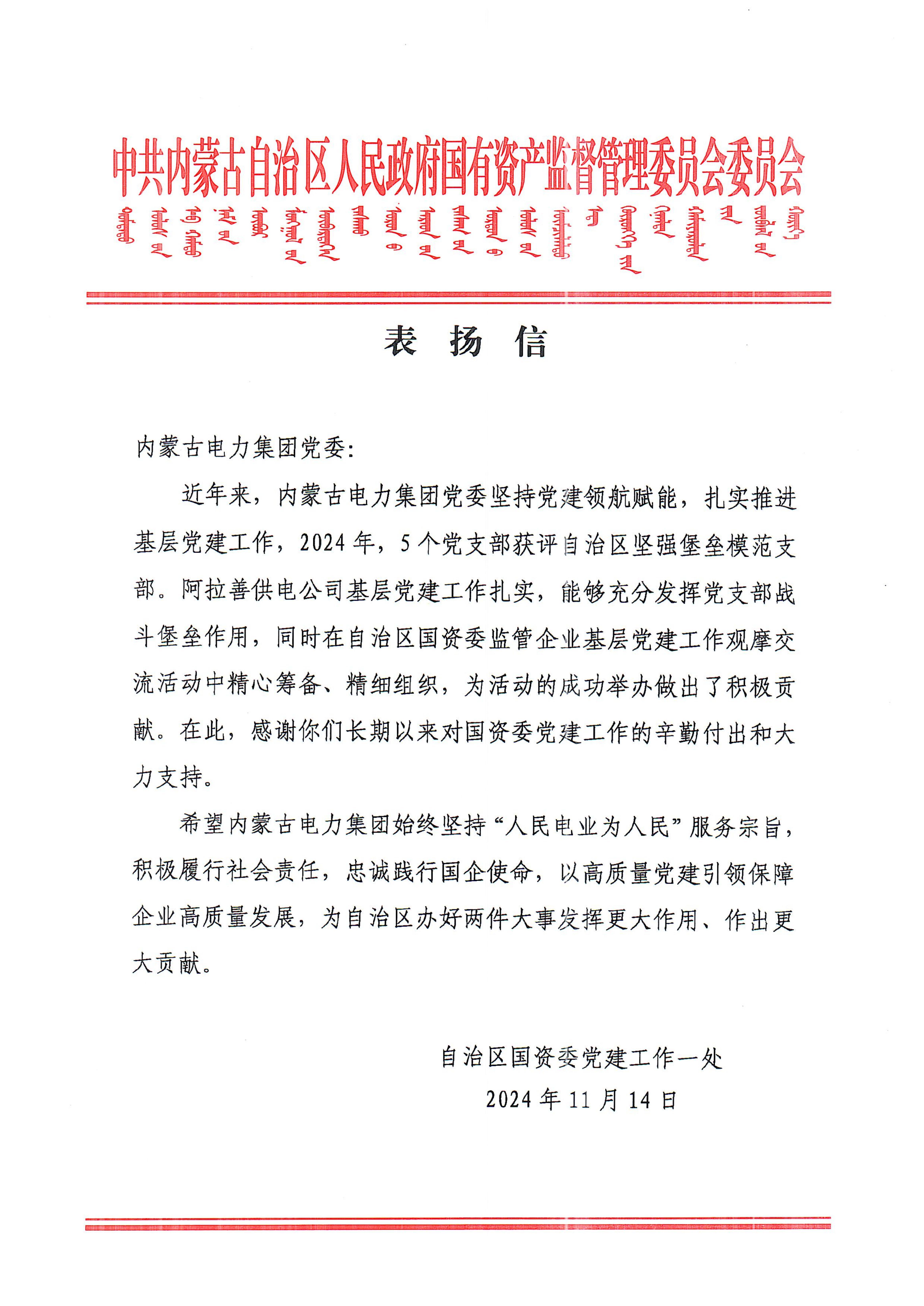 近年来,内蒙古电力集团党委坚持党建领航赋能,扎实推进基层党建工作,2024年,5个党支部获评自治区坚强堡垒模范支部。阿拉善供电公司基层党建工作扎实,能够充分发挥党支部战斗堡垒作用,同时在自治区国资委监管企业基层党建工作观摩交流活动中精心筹备、精细组织,为活动的成功举办做出了积极贡献。在此,感谢你们长期以来对国资委党建工作的辛勤付出和大力支持。