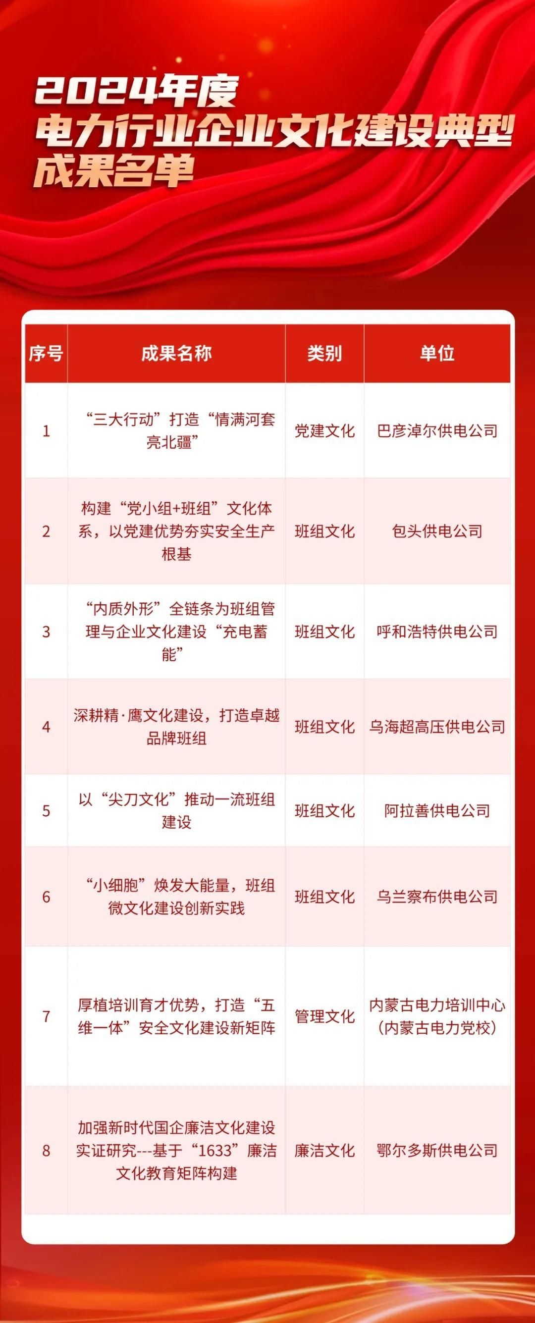 近日,中国电力企业联合会发布《2024年度电力行业企业文化建设典型成果及典型实践单位名单》,内蒙古电力集团企业文化建设成果喜获丰收,集团公司及包头供电公司获评“2024年度电力行业企业文化建设典型实践单位”,8项成果入选“2024年度电力行业企业文化建设典型成果”。