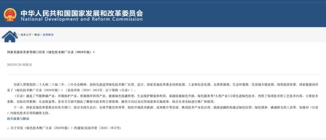 据悉,本次《推广目录》是国家发改委继2020年首次发布后时隔四年第二次发布,此次推荐目标是以协同推进降碳、减污、扩绿、增长为目标,以加快推动绿色低碳转型产业发展为重点,聚焦关键工艺流程和生产环节,择优推荐先进适用绿色技术。涉及节能降碳产业、环境保护产业、资源循环利用产业、能源绿色低碳转型、生态保护修复和利用、基础设施绿色升级领域的相关技术,入选项目包括降碳产业技术、资源循环利用、生态保护修复利用等七大类112项。