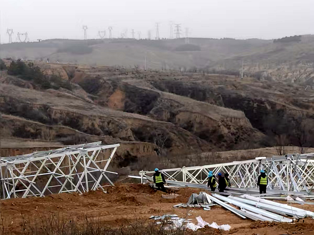3月28日,在巴彦淖尔市磴口县河套–祥泰–千里山Ⅱ、Ⅲ回500千伏线路工程现场,施工人员正在进行地面组塔及铁塔吊装工作,计划抢在春耕前完成163基农田区铁塔组立工作。