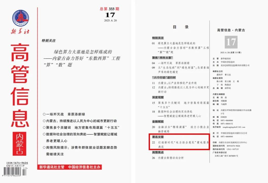 近日,由新华通讯社主管、中国经济信息社主办的《高管信息》(总第333期),刊发了内蒙古电力集团巴彦淖尔供电公司助企服务典型案例《打造新时代“电力助企惠民”蒙电服务典范》。该案例聚焦自治区“六大行动”,生动展现了电力助企惠民的创新实践与显著成效。