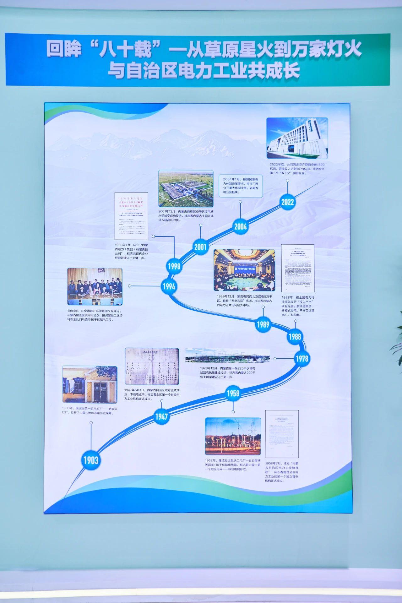 走进展馆B区的自治区国有企业展示区,内蒙古电力集团的展位透着厚重的历史感。这里用一条清晰的时间轴,把内蒙古电力的八十年故事铺展开来。