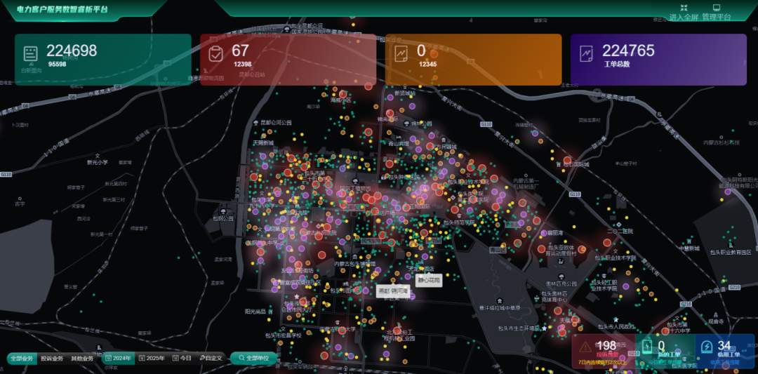 “客户数智睿析微应用”以工单数据智能流转解构电力服务新场景,可视化动态客户服务热力图生成“服务工单看板”,按小区标注包头市全域服务工单,实现“一图知全局”服务态势掌控,应用上线以来,累计处理12398、95598、12345等服务工单数据超40万条,通过全量服务数据深度挖掘,拓展了敏感区域预警、设备健康预判、能源服务创新等新兴业务。