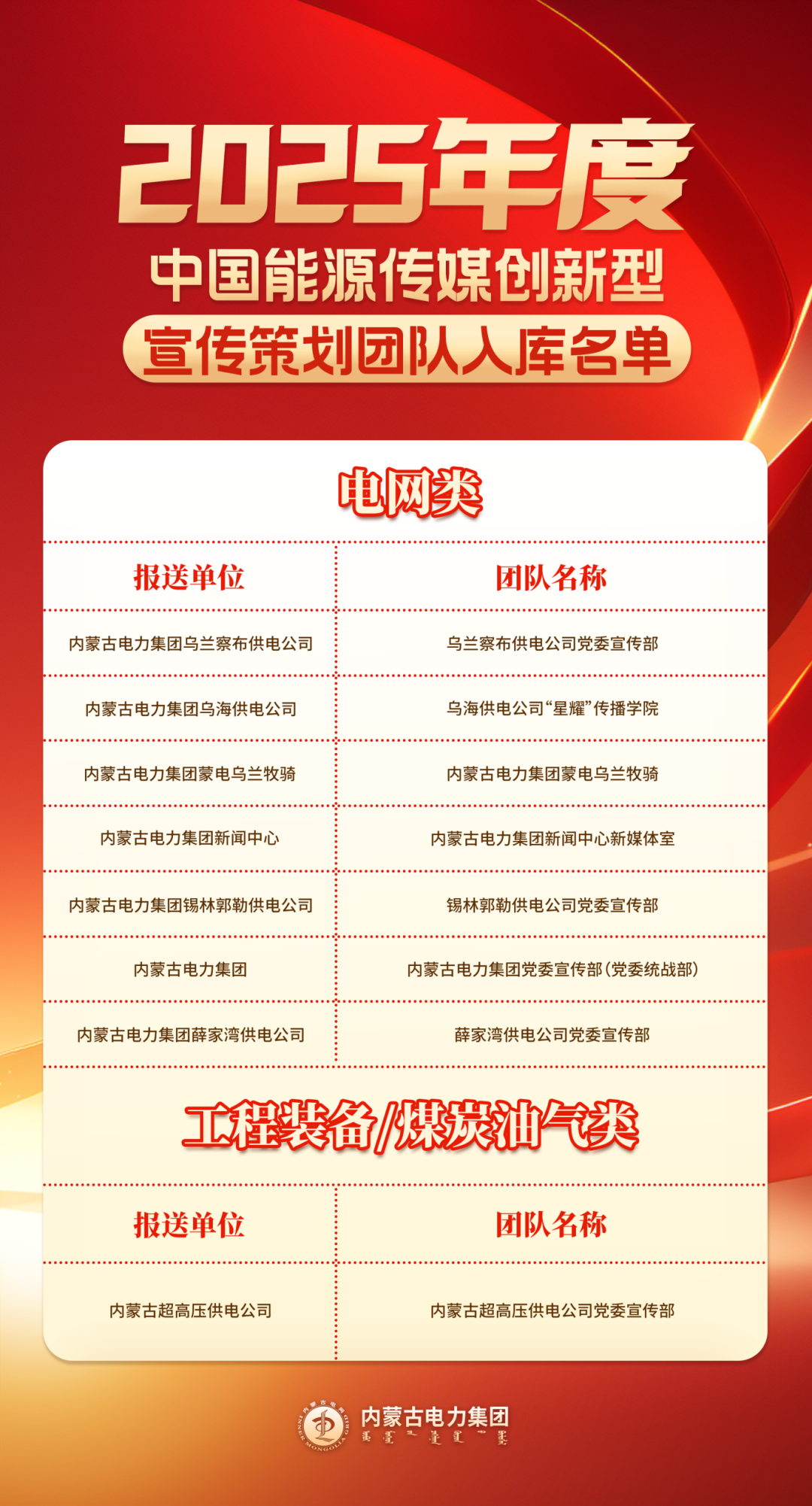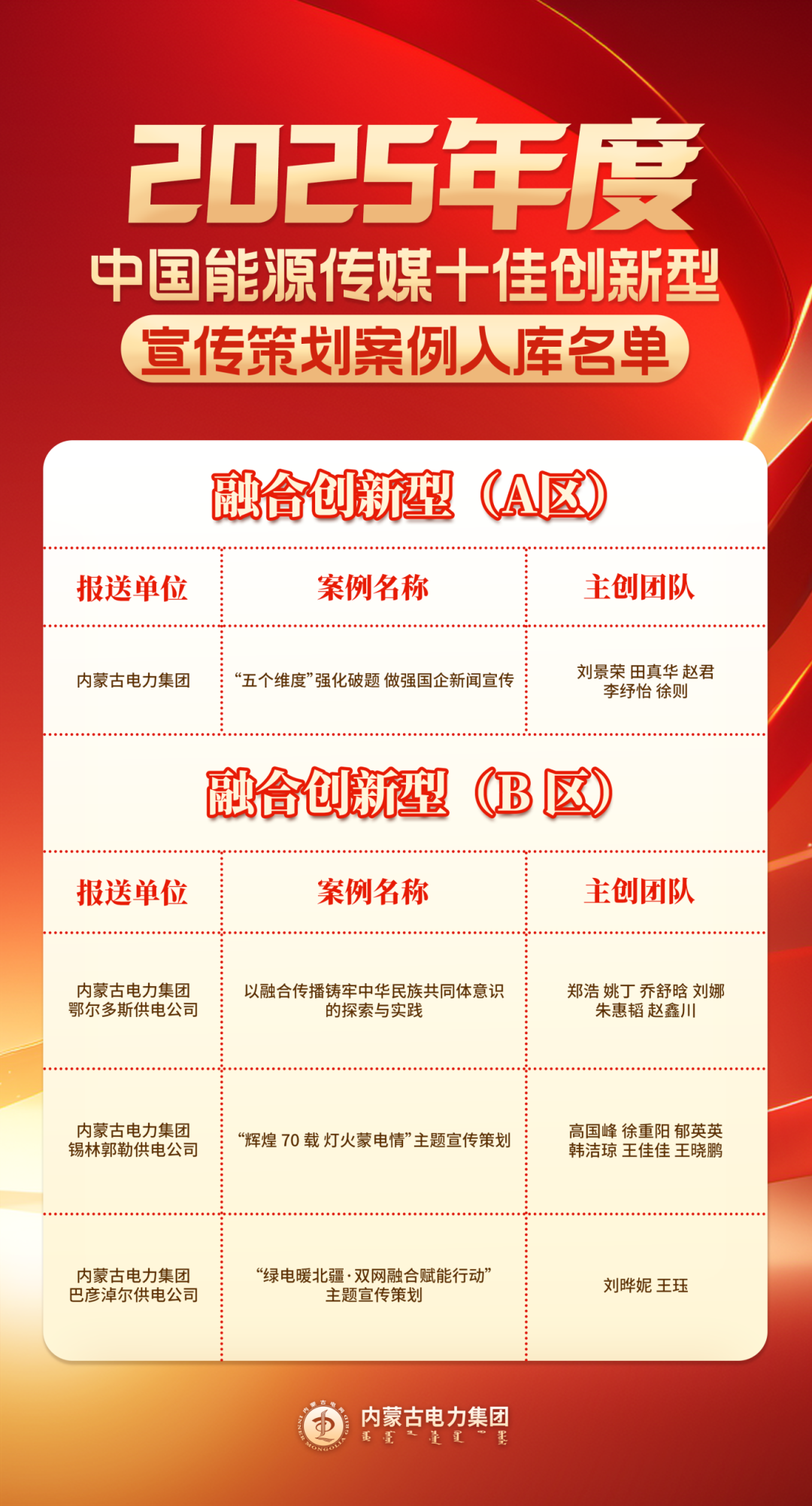 11月27日至28日,“2025年中国能源传媒宣传策划工作会”召开,会议同期举行中国能源传媒宣传策划案例库启动仪式及入库案例颁奖环节。内蒙古电力集团凭借扎实的宣传策划功底、鲜明的草原能源特色与创新的传播实践,多部作品及多个宣传团队成功入选2025年度中国能源传媒典型宣传策划案例库,斩获多项荣誉,充分彰显了在能源宣传领域的过硬实力与创新成效。